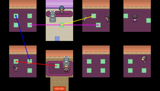 The below image shows how every warp in the gym maps to each other. Dual-color warps are part of a one-way warp, moving from the fill color to the matching outline.